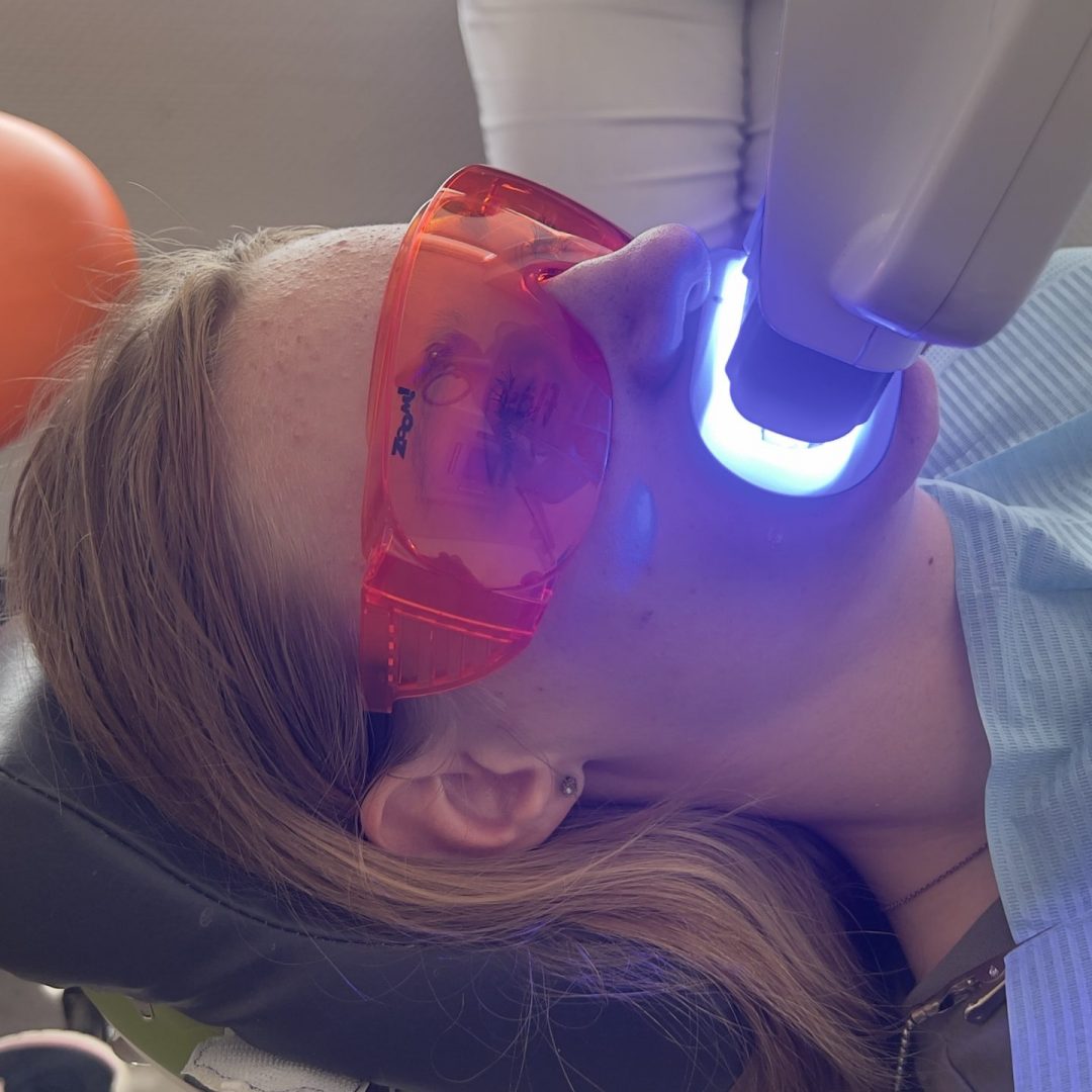 Aktivierung durch die LED-Lampe: Über Ihren Zähnen wird eine spezielle LED-Lampe platziert, die die Aktivierung des Bleichgels beschleunigt. Dieser Schritt dauert normalerweise etwa 15 Minuten und kann je nach Bedarf wiederholt werden.